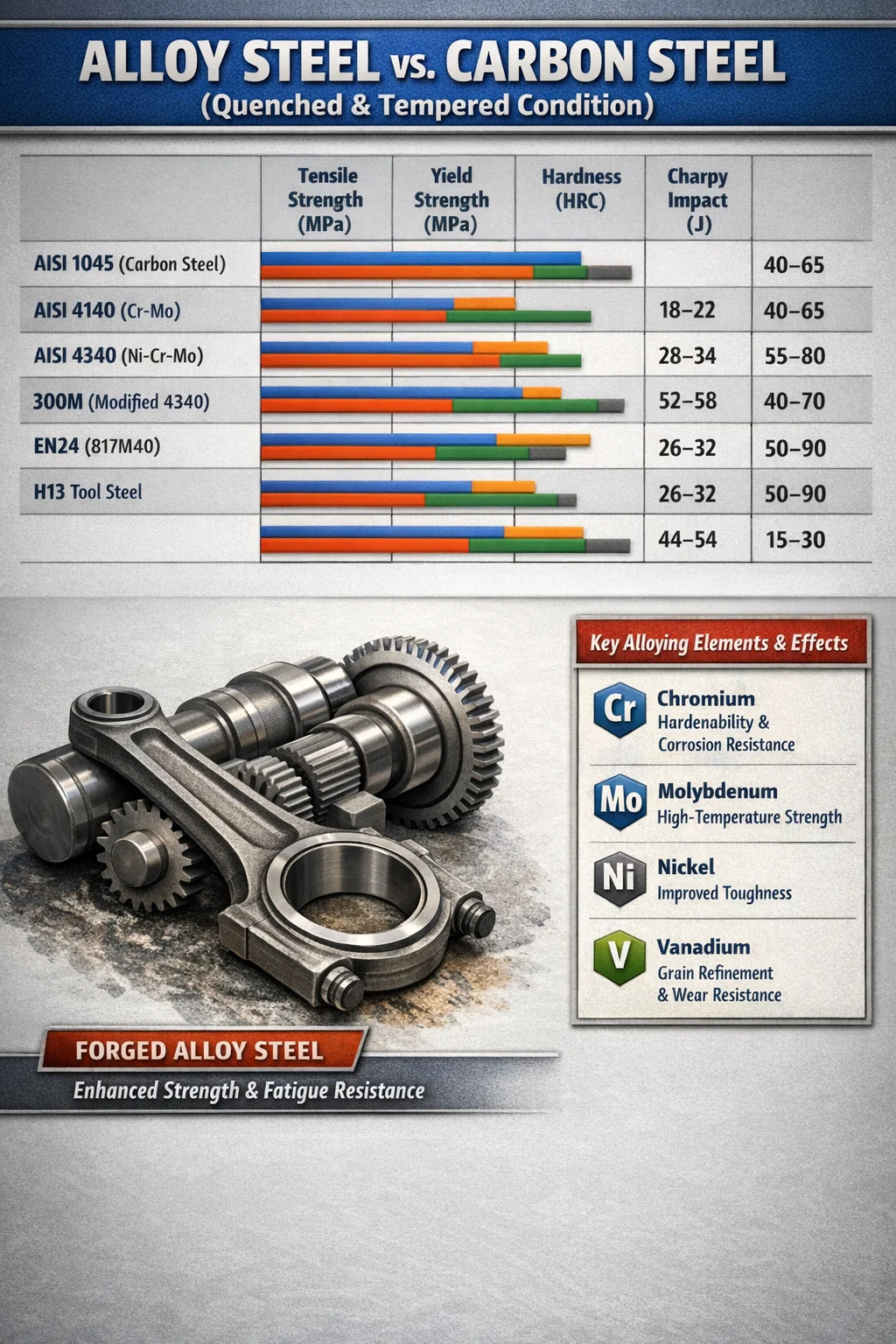 4140 mixtura chalybs cum suis chromium et molybdaeno additamentis in substantia meliorem duritiem servat. Obduratio uniformi martensita consequi potest ad circiter 75mm diametrum in oleo restinguendo. 4340, addito nickel contento, hoc ad 100 mm vel ultra in oleo restinguendo extendit. Pro malleolis ferri mixturae supra 200mm in sectione transversali critica, gradus ad sectiones magnas specialiter destinatae — sicut 26NiCrMoV14—5 vel 34CrNiMo6 — requiruntur ut minimum praebeant vires specificationes per sectionem, non solum prope superficiem.
