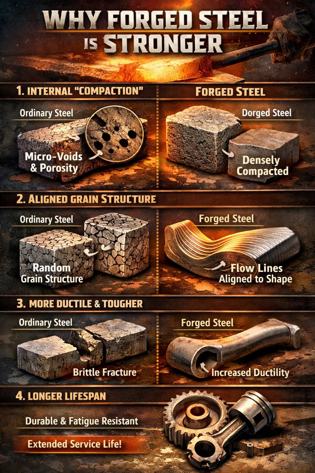 Ferrum fictum: Sub immensa pressione, parvae poros omnino complanantur et in unum conflati sunt, totum metallum densissimum sicut stipitem solidum efficiunt. Sine interioribus vitiis, pars naturaliter fortior est.