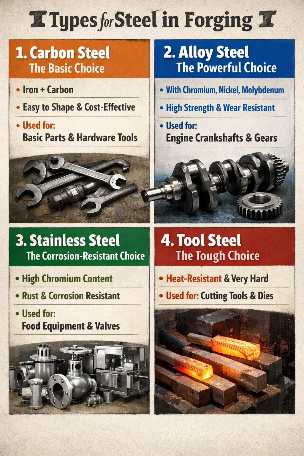 In ipsa productione industriae, non omnis chalybs aptus est ad "calefactionem et percussionem". Curet ut partes consequentes sint et firmae et durabiles; ferro cudendum typice utitur ad sequentes rationes amet ferri, secundum applicationem: